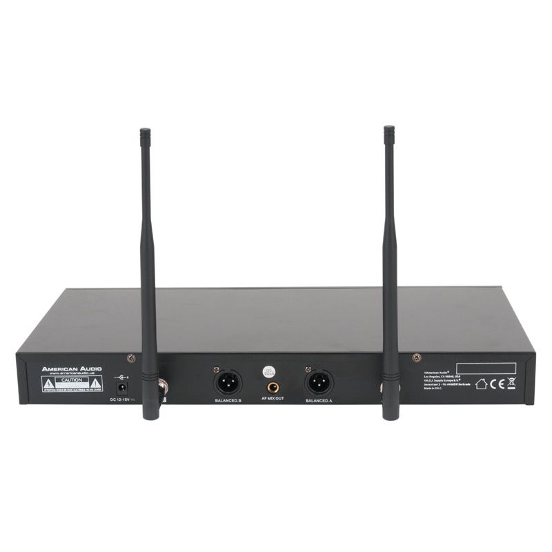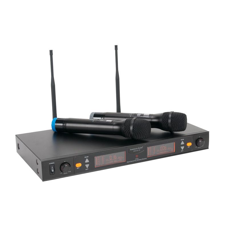 The American Audio WM219 is a 2-channel UHF wireless microphone system that includes two wireless microphones, two different color coded rings (to differentiate each microphone) and a wireless receiver with individual volume control and audio input for each microphone.
