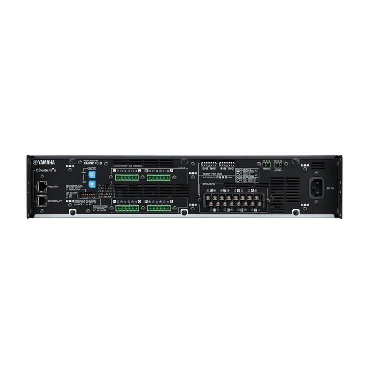 The Yamaha XMV8140-D power amplifier is equipped with Dante digital audio network for larger venues where long distance cabling is required.
